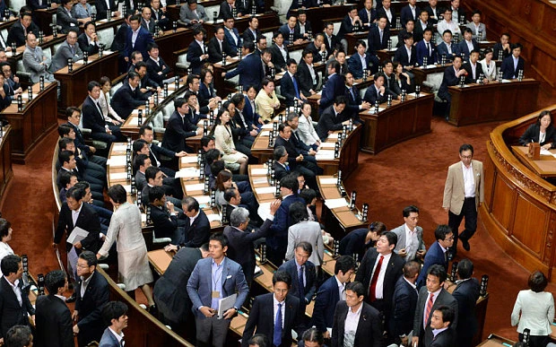 Đảng Tự do Dân chủ của Thủ tướng Shinzo Abe đã tiến hành bỏ phiếu thông qua dự luật, trong khi các đảng đối lập khác biểu tình phản đối ở bên ngoài.