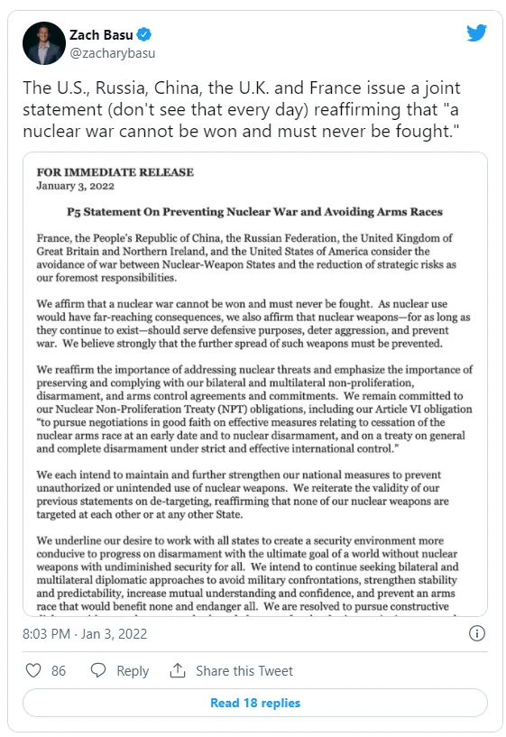 Năm cường quốc thế giới Trung Quốc, Pháp, Nga, Anh và Mỹ đã đưa ra một tuyên bố chung vào ngày 3-1, khẳng định phản đối việc sử dụng hạt nhân cho mục đích chiến tranh và hứa sẽ cùng nhau giải trừ vũ khí hạt nhân.