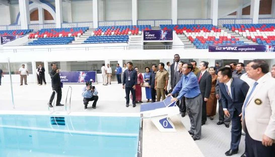 Thủ tướng Campuchia Hun Sen kiểm tra một hồ bơi của khu liên hợp thể thao quốc gia Morodok Techo hôm 4-4. Ảnh: Phnompenh Post