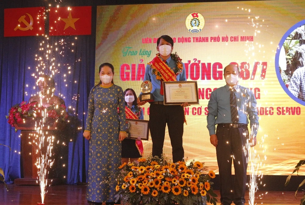 Anh Phạm Đình Hùng (Chủ tịch công đoàn cơ sở Công ty TNHH Nidec Servo Việt Nam) tự hào khi nhận giải thưởng 28-7. Ảnh: KHÁNH CHI