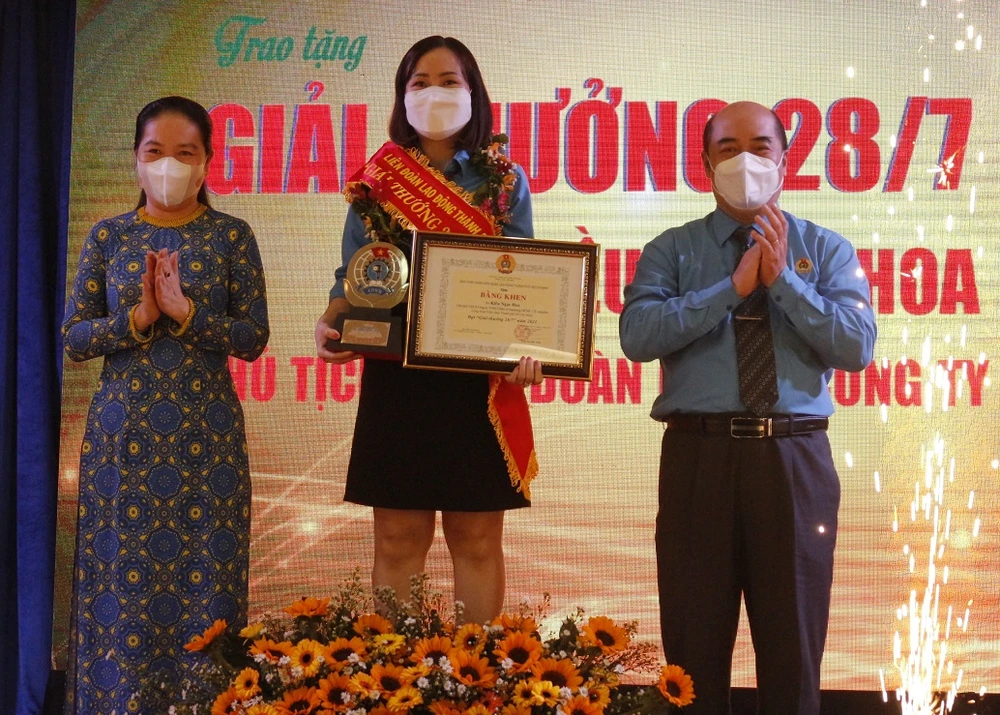 Chị Kiều Ngọc Hoa (Chủ tịch công đoàn cơ sở Công ty TNHH điện tử Samsung) nhận giải thưởng 28-7. Ảnh: KHÁNH CHI