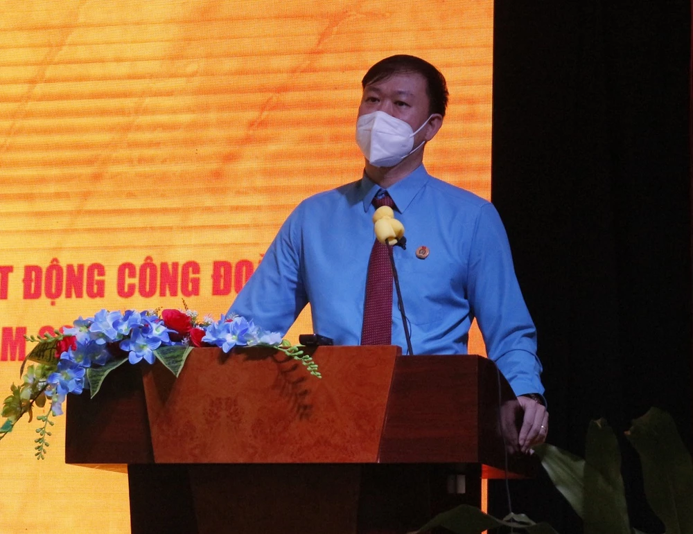 Phó chủ tịch Liên đoàn Lao động TP.HCM Hồ Xuân Lâm phát biểu tại hội nghị. Ảnh: KHÁNH CHI