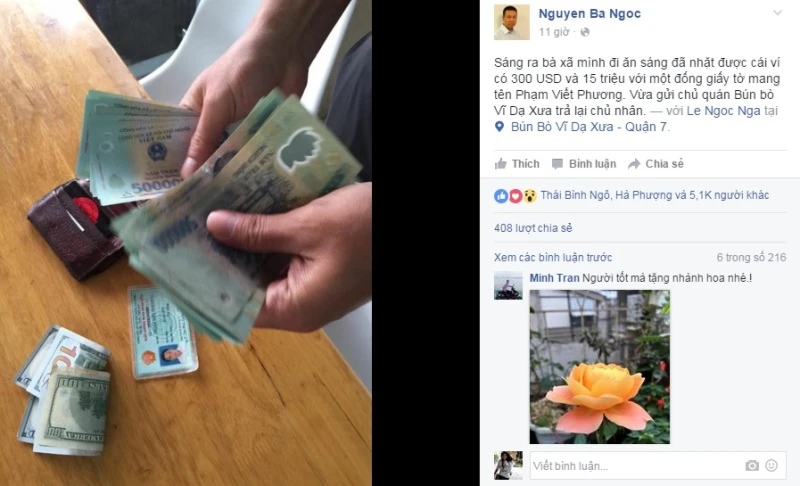 Sáng 10-3, cộng đồng mạng liên tục chia sẻ câu chuyện cặp vợ chồng đi ăn sáng nhặt được ví tiền và nhờ chủ quán trả lại cho khổ chủ. Dòng tâm sự ngắn gọn: “Sáng ra bà xã mình đi ăn sáng đã nhặt được cái ví có 300 USD và 15 triệu đồng với một đống giấy tờ mang tên Phạm Viết Phương. Vừa gửi chủ quán bún bò Vĩ Dạ Xưa trả lại chủ nhân” - hiện tại đã nhận được hàng ngàn lời cám ơn, chia sẻ.