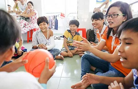 Các tình nguyện viên nhóm Happier chăm sóc tinh thần cho các bệnh nhi tại BV Nhi đồng 1. Đây là một trong những dự án đã được LIN tài trợ. Ảnh: Quang Trầm