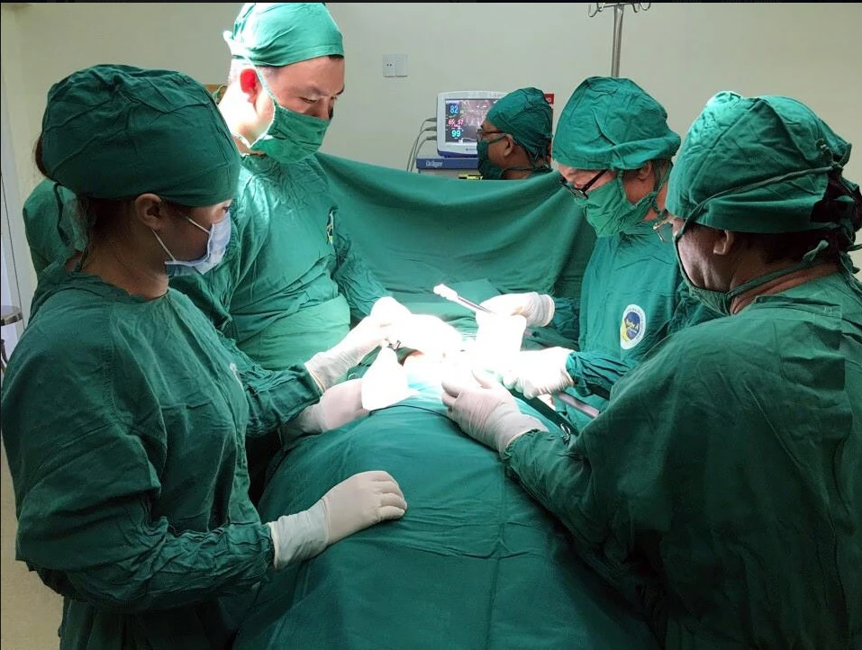 Các bác sĩ đang phẫu thuật nâng ngực cho em M. Ảnh: LÊ PHỤNG