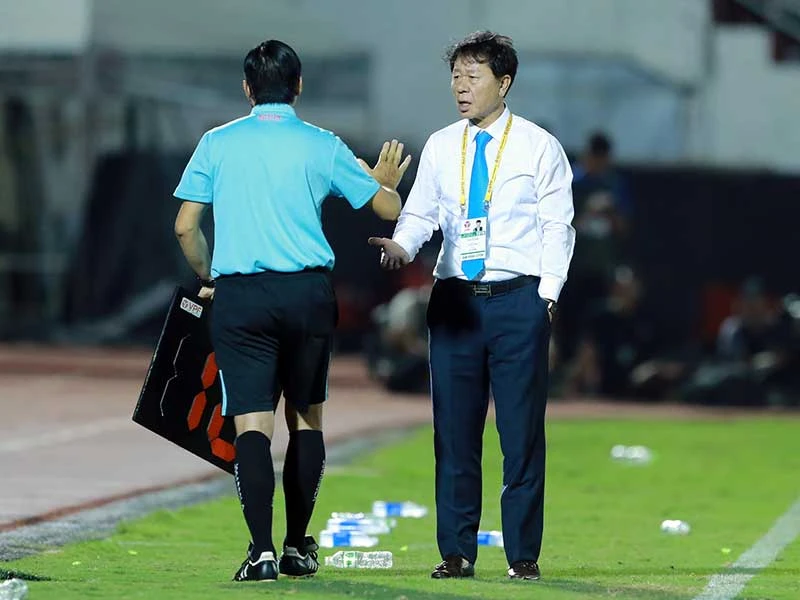 HLV Chung Hae-seong phản ứng trọng tài. Ảnh: X.HUY