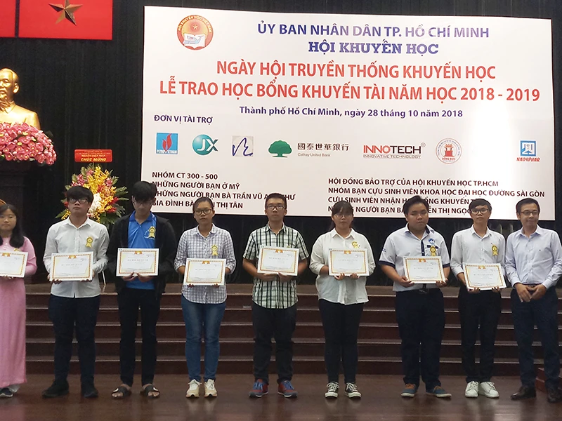 | Quỹ học bổng đầy ý nghĩa và thiết thực Học bổng Khuyến tài thuộc Hội Khuyến học TP đã tiếp sức cho hàng ngàn học sinh giỏi, có hoàn cảnh khó khăn được tiếp tục học tập và hoàn thành bậc đại học. Điều đáng ghi nhận là học bổng đã được nhiều người trẻ tham gia, nhất là những em từng nhận học bổng trở về chung tay vận động đóng góp với ý nghĩa “người đi trước rước người đi sau”. Tôi đánh giá cao ý nghĩa và kết quả thiết thực mang lại từ học bổng Khuyến tài của Hội Khuyến học TP. Tôi biểu dương lãnh đạo Hội Khuyến học TP và các quận, huyện đã có sáng kiến thành lập quỹ học bổng và luôn chăm chút, phát triển, không ngừng nâng cao chất lượng và hiệu quả của học bổng. Ông HUỲNH CÁCH MẠNG, Thành ủy viên, Phó Chủ tịch UBND TP.HCM 23 tỉ đồng đến tay sinh viên nghèo học giỏi Sáng 28-10, tại Hội trường Thành ủy TP.HCM diễn ra ngày hội Khuyến học, lễ trao học bổng Khuyến tài năm học 2018-2019. Năm học này có 534 sinh viên nhận học bổng 1&1 với số tiền hơn 1,8 tỉ đồng. Đến nay, sau 18 năm thực hiện, chương trình học bổng Khuyến tài đã trao tặng cho 2.526 sinh viên với tổng số tiền trao học bổng cho các em trong suốt các năm đại học là gần 23 tỉ đồng. |