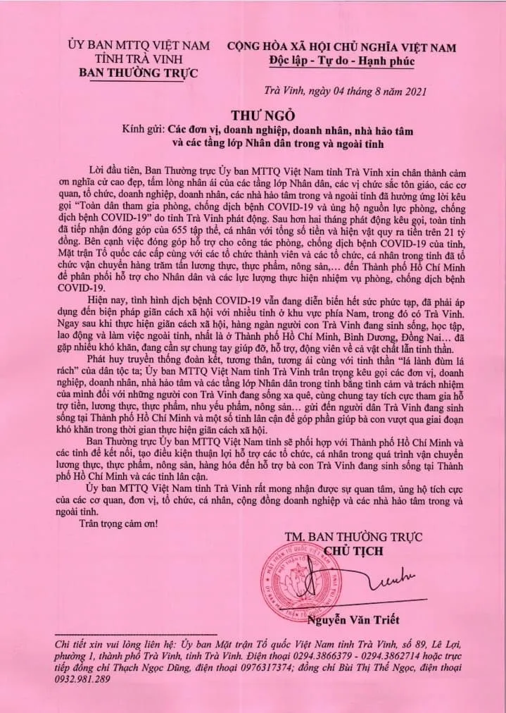 Thư ngỏ kêu gọi hỗ trợ của Ban thường trực Ủy ban MTTQ Việt Nam tỉnh Trà Vinh