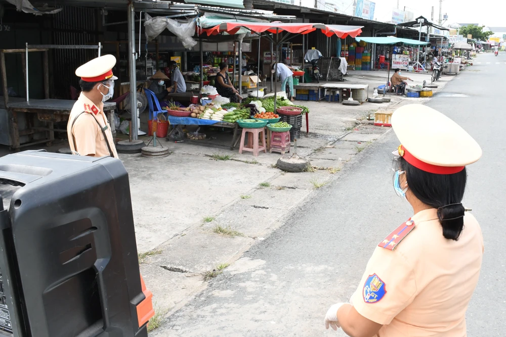 Cảnh sát giao thông huyện Tiểu Cần (địa phương bình thường mới) tuyên truyền phòng chống dịch COVID-19 ở khu vực chợ. Ảnh: HỒ GIANG