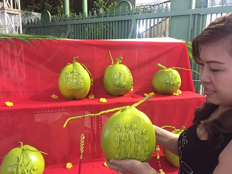 Anh Huỳnh Thanh Tâm ở thị trấn Châu Thành, huyện Châu Thành, Bến Tre cho hay lần đầu tiên tạo hình thành công đòn bánh tét, hình hồ lô cho trái dừa. Nếu trái dừa có in chữ phúc, lộc, thọ… chỉ mất khoảng 20 ngày là cho ra sản phẩm thì để tạo hình đòn bánh tét và hồ lô mất khoảng ba tháng. Hơn nữa khi ép khuôn, trái dừa dễ vỡ nên mỗi chùm chỉ chọn được vài trái để tạo hình. Hiện giá bán tại vườn mỗi trái dừa loại này 600.000 đồng.