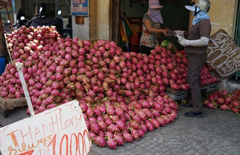 DN Việt Nam cần bỏ cách bán hàng kiểu đổ đống nông sản như trong nước, nếu không sẽ bị đánh bật khỏi thị trường nước ngoài. Trong ảnh: Thanh long bán đổ đống đầy đường với giá thấp. Ảnh: TTO