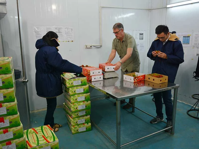 Chuyên gia của Cục Quản lý Thực phẩm và Dược phẩm Mỹ (FDA) đang kiểm tra chôm chôm Việt trước khi đưa vào chiếu xạ. Ảnh: QH