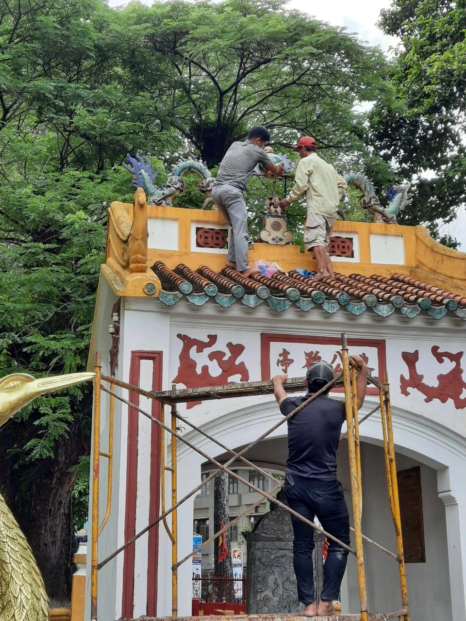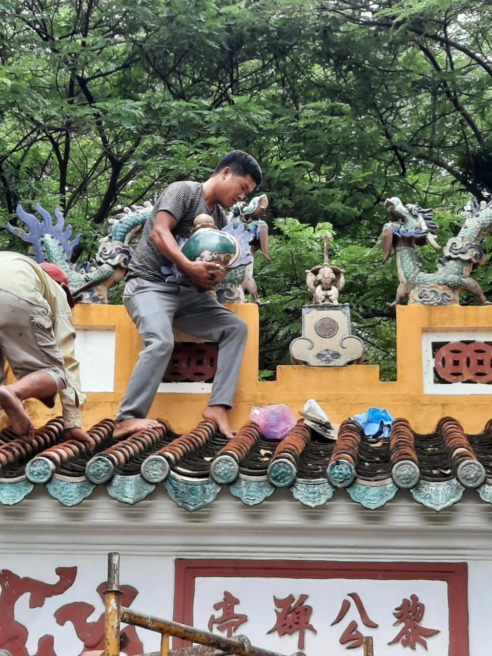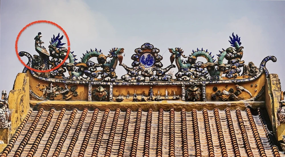 Hệ thống tượng bát tiên trên nóc tiền điện đã mất bảy vị tiên, chỉ còn một vị tiên. Ảnh: Q.T