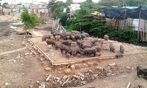 Trại heo này được thả rông, chăn nuôi trên một bãi đất trống rộng khoảng 400m² nằm sát bên đường Phạm Văn Đồng, gần cầu Rạch Lăng (phường 13, quận Bình Thạnh, TP.HCM), với số lượng từ 40-50 con.