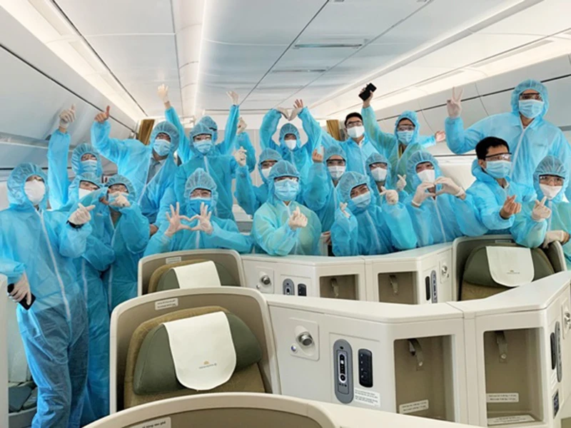 Đoàn tiếp viên trên những chuyến bay đón khách từ vùng tâm dịch phải mặc trang phục bảo hộ y tế hơn 10 tiếng. (Ảnh do VNA cung cấp)
