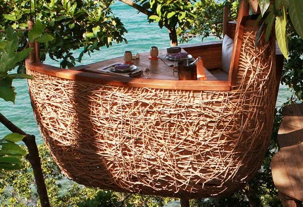 Những cái Pod dệt này cách mặt đất khoảng 16 feet, nép mình trong tán cây, phù hợp với bốn thực khách.