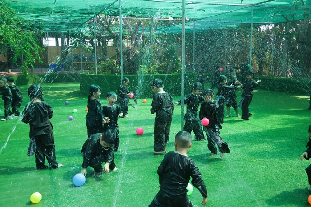 Học sinh thích thú khi tắm mưa tại Dragon farm. Ảnh: TP