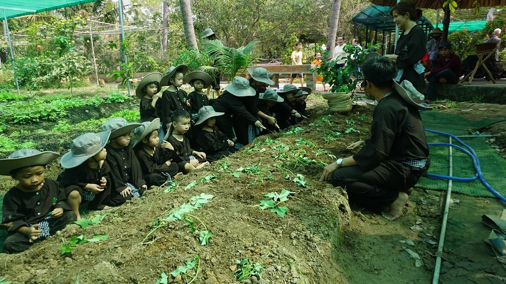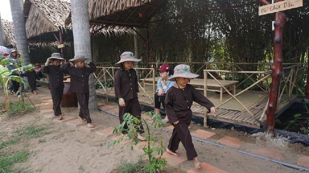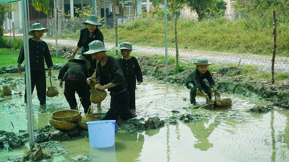 Trong bộ đồ bà ba, các bé sẽ được hóa thân thành người nông dân chân lấm tay bùn, trải nghiệm nhiều hoạt động bổ ích như chèo xuồng, cuốc đất trồng khoai, tát mương bắt cá, đi cầu khỉ, gieo mạ cấy lúa, trồng cây ăn trái…