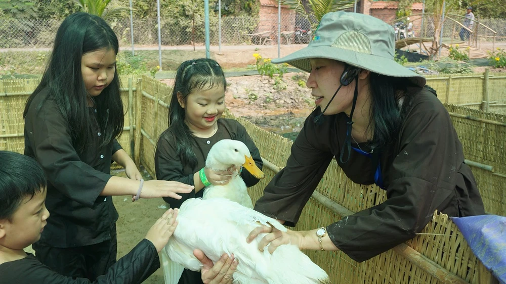 Các bé thích thú khi vào chuồng bắt vịt. Ảnh: NGUYỄN QUYÊN
