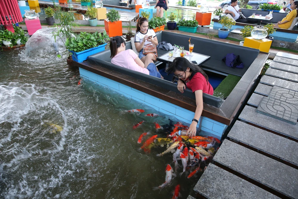 Hồ nước được chủ quán thả 300 kg cá koi với đủ màu sắc, thực khách đến đây được trải nghiệm cảm giác ngồi dưới lòng hồ thưởng thức cà phê, vừa ngắm đàn cá Koi bơi lội.