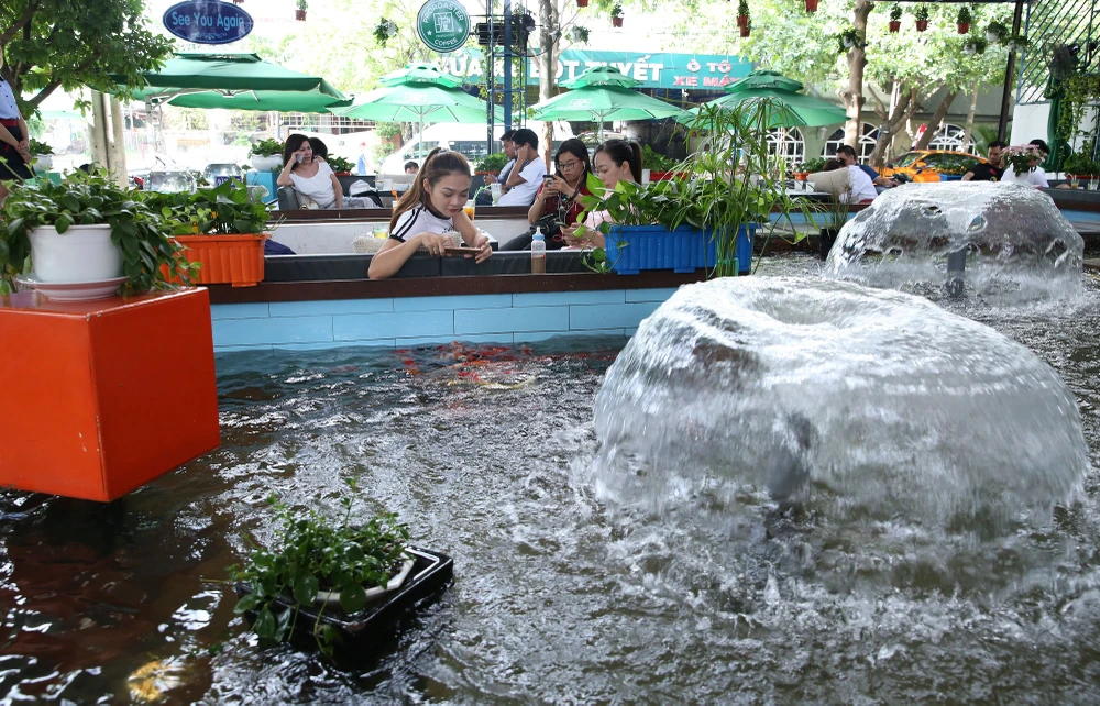 Hơn một tháng nay, một quán cà phê trên đường Khổng Tử (quận Thủ Đức, TP.HCM) thu hút nhiều khách tham quan với thiết kế không gian chính của quán là một hồ nước và đặt những chiếc bàn vào giữa lòng hồ.