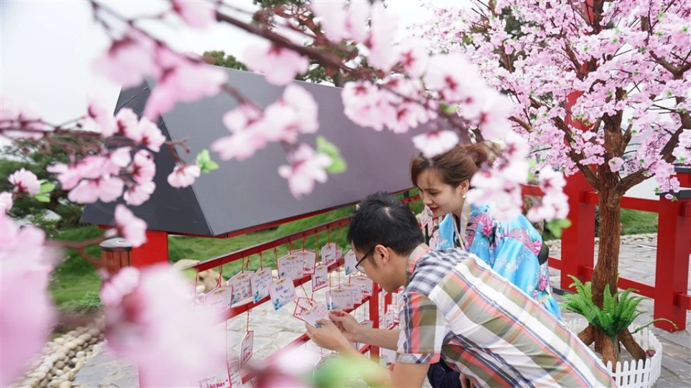 Sắc sakura hồng thắm, biểu trưng mô phỏng ngôi đền Itsukushima huyền thoại, những chú mèo thần tài, mô hình tòa thành Edo cổ kính,… cùng vô vàn tiểu cảnh được bài trí khắp không gian như mang cả nước Nhật thu nhỏ về thành phố di sản.