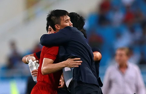 Thầy trò Hữu Thắng, Công Vinh ôm nhau hạnh phúc với những trái ngọt sau giai đoạn đổi mới đội tuyển. Ảnh: QUANG THẮNG