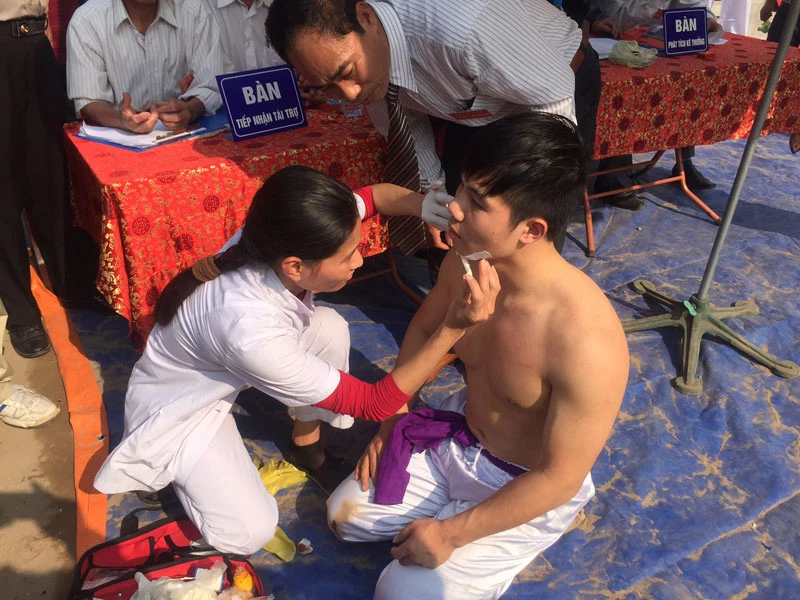 Cũng có những trường hợp bị thương do va chạm hoặc quả cầu đập vào cơ thể, chân tay khiến người chơi bị thương. Nhân viên y tế sẽ băng bó ngay tại sân đấu.
