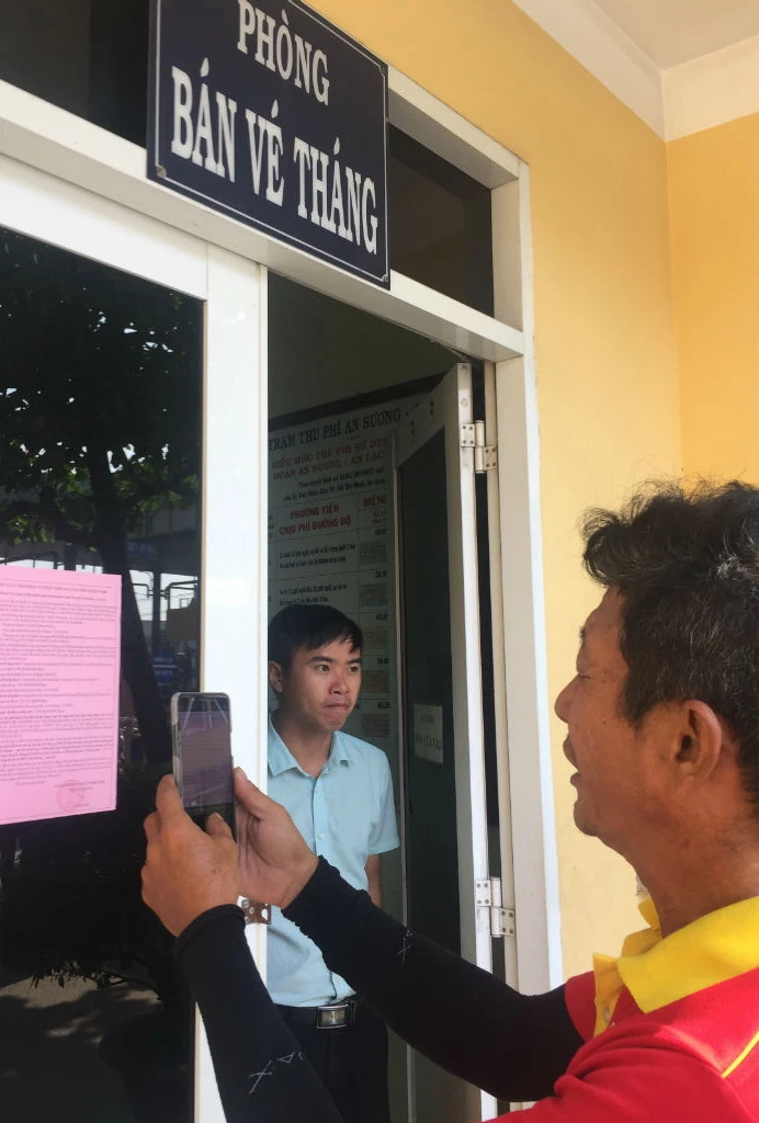 Một tài xế sau khi đọc bản thông tin dán trước cửa phòng bán vé tháng đã chụp hình lại.