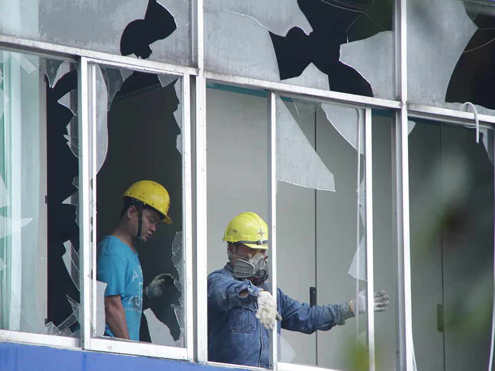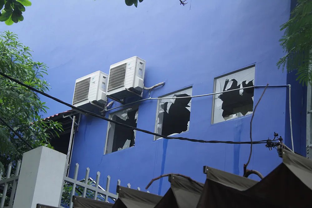 Nhiều cửa kính tại trạm biến áp vỡ tan, khung cửa rời ra ngoài do sức ép.
