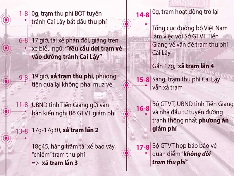 Các mốc sự kiện xảy ra sau khi trạm thu phí Cai Lậy hoạt động. Đồ họa: THÙY TRANG