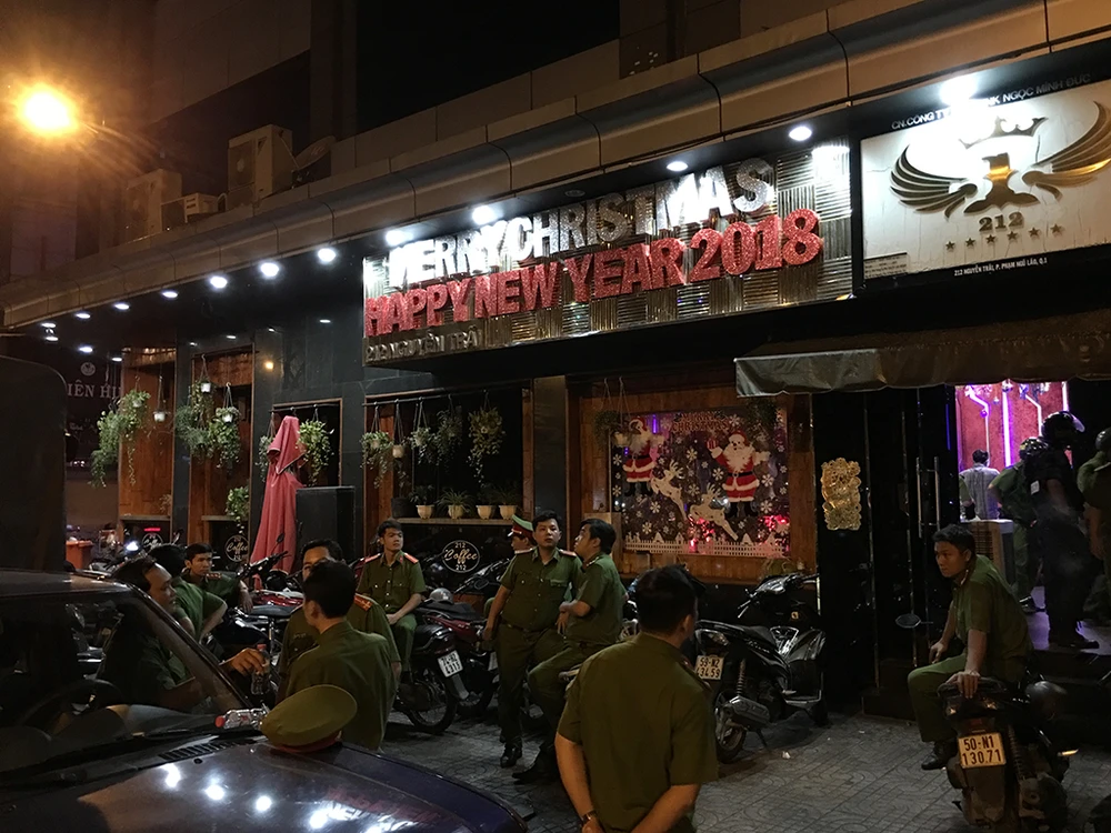 Rạng sáng 30-12, hàng trăm cán bộ, chiến sĩ thuộc Phòng Cảnh sát quản lý hành chính về trật tự xã hội, hình sự, cơ động, CSGT phối hợp cùng Đoàn 1 kiểm tra liên ngành văn hóa-xã hội TP.HCM kiểm tra đột xuất hai quán bar cực lớn ở trung tâm quận 1.