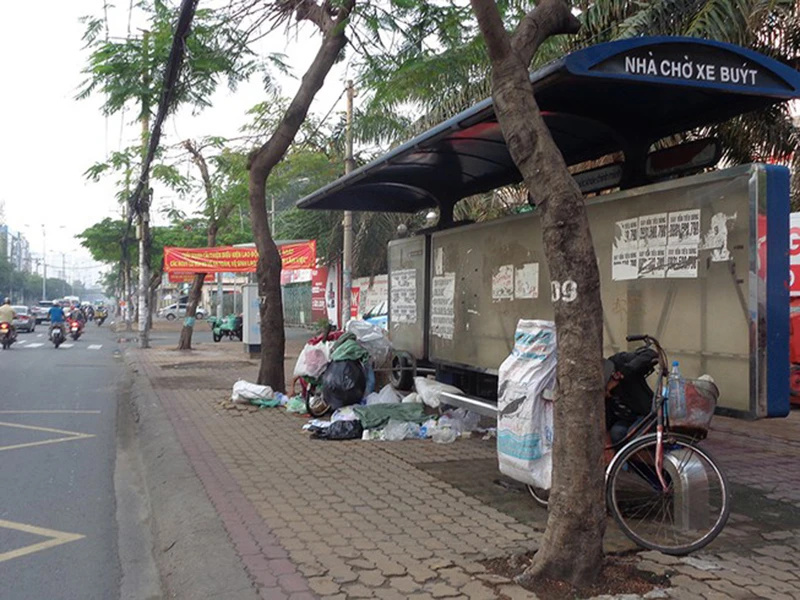 Hình ảnh cho thấy trạm chờ xe buýt số 79B dán đầy giấy rao vặt trên tấm bảng, người và xe đạp chiếm ghế của hành khách. Vây quanh trạm là rác và rác khiến nhiều hành khách không dám ngồi chờ xe (ảnh 1).