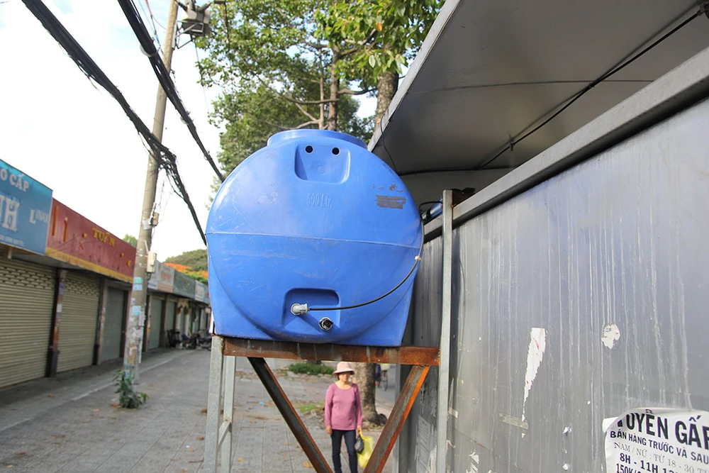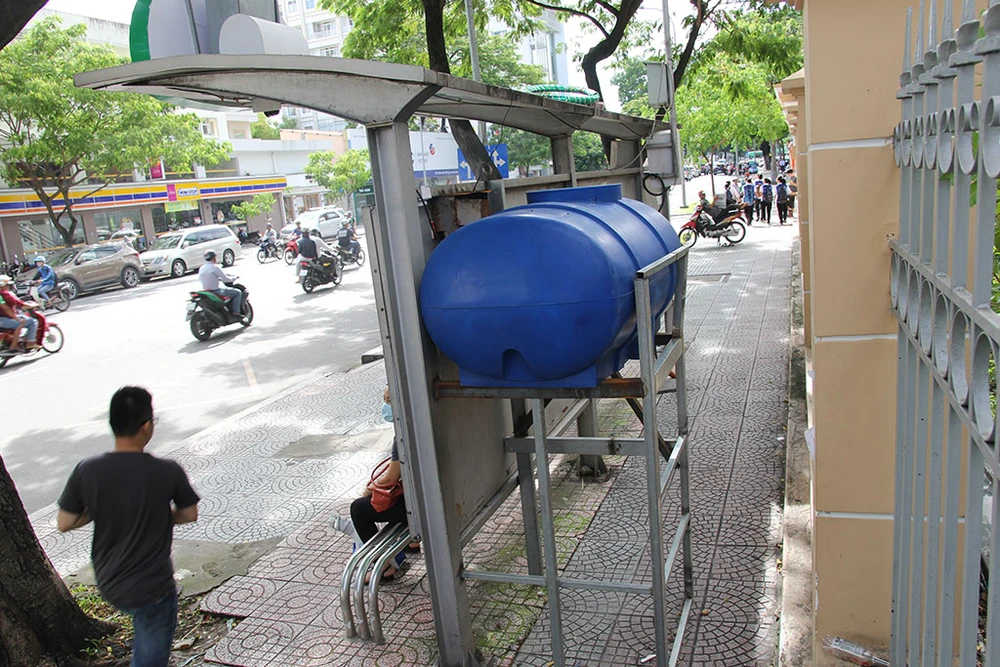 Bồn chứa nước phun sương gắn phía sau trạm chờ xe buýt.