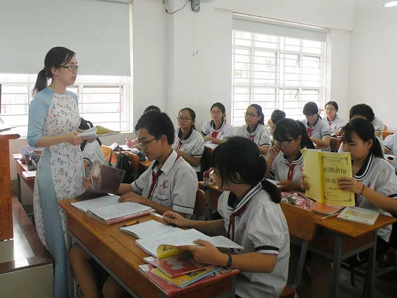 Ngoài việc dạy, giáo viên một số trường còn phải làm rất nhiều công việc khác.Trong ảnh: Giáo viên Trường THCS Âu Lạc, quận Tân Bình trong một tiết dạy.Ảnh minh họa: NGUYỄN QUYÊN