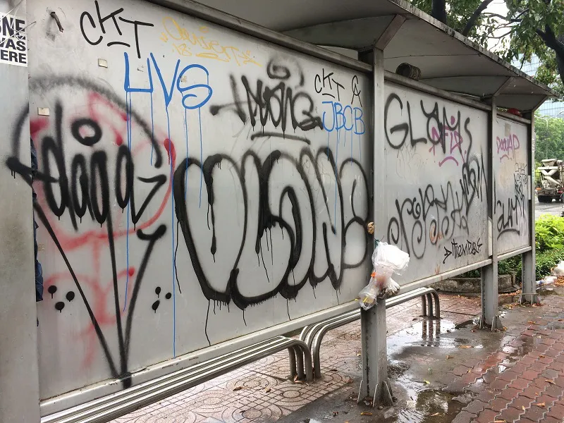 Đến khu vực trung tâm quận 1 cũng không thiếu hình ảnh vẽ bậy. Tại trạm dừng trên đường Hai Bà Trưng, quận 1 bị bôi bẩn với những hình ảnh vẽ đen, đỏ này.