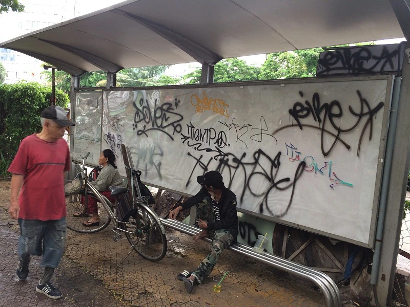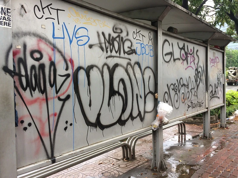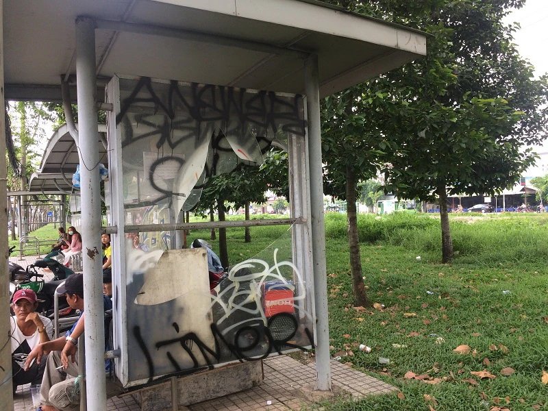 Ghi nhận dọc tuyến đường xa lộ Hà Nội, tại hai trạm xe buýt thuộc phường An Phú (quận 2) xuất hiện dày đặc các hình vẽ xấu xí bằng sơn đen. Nhiều trạm cũng đang bị xuống cấp, kính bên hông vỡ nát gây nguy hiểm cho nhiều người.