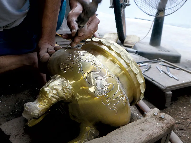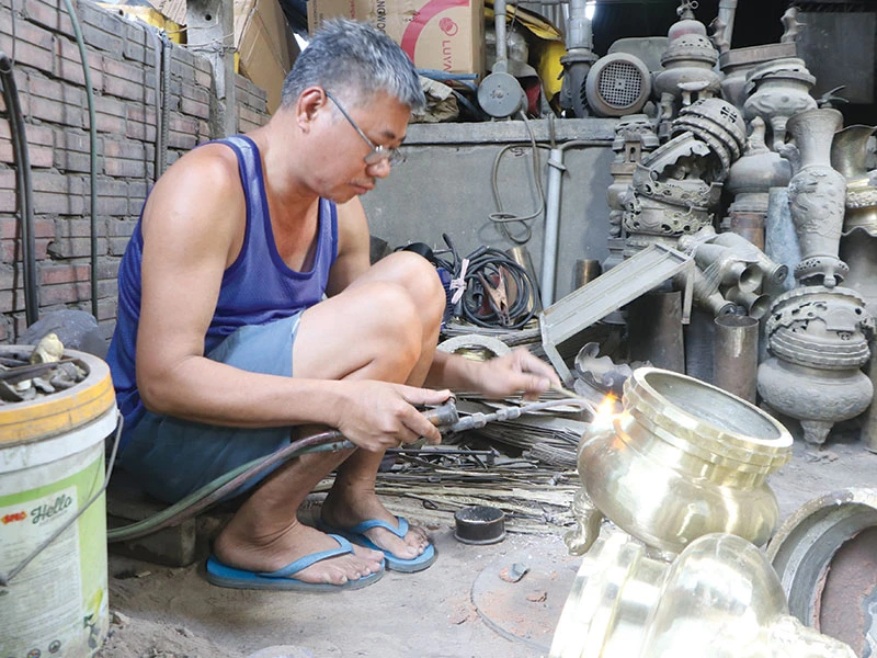 Gần đó, ông Tư, một nghệ nhân cũng quá 50 năm làm nghề đúc đồng, tự hào chia sẻ: Nghề đúc lư đồng này vất vả lắm mà không phải ai muốn làm cũng làm được. Để cho ra sản phẩm đẹp, tinh tế thì tất cả công đoạn phải được làm thủ công. Thế nên đòi hỏi người thợ không chỉ cần có tay nghề cao mà còn phải kiên trì, khéo léo, tỉ mỉ. Mỗi người thợ thường chỉ đảm nhiệm một công đoạn riêng.