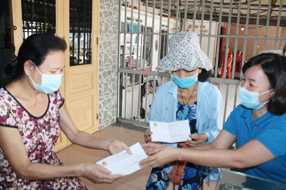 Bà Trương Thị Bích Hạnh (phải) tặng quà cho công nhân, người lao động gặp khó khăn trong dịch COVID-19. Ảnh: HOÀNG TRUNG