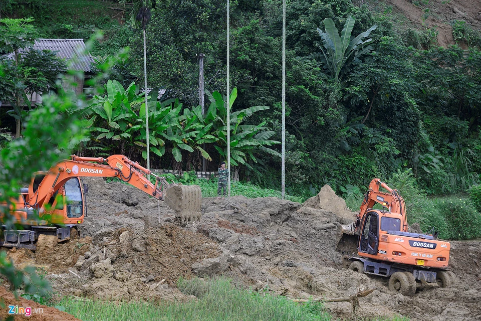Hàng chục chiếc máy xúc cùng nhiều phương tiện khác được huy động để tìm kiếm nạn nhân sau vụ sạt lở
