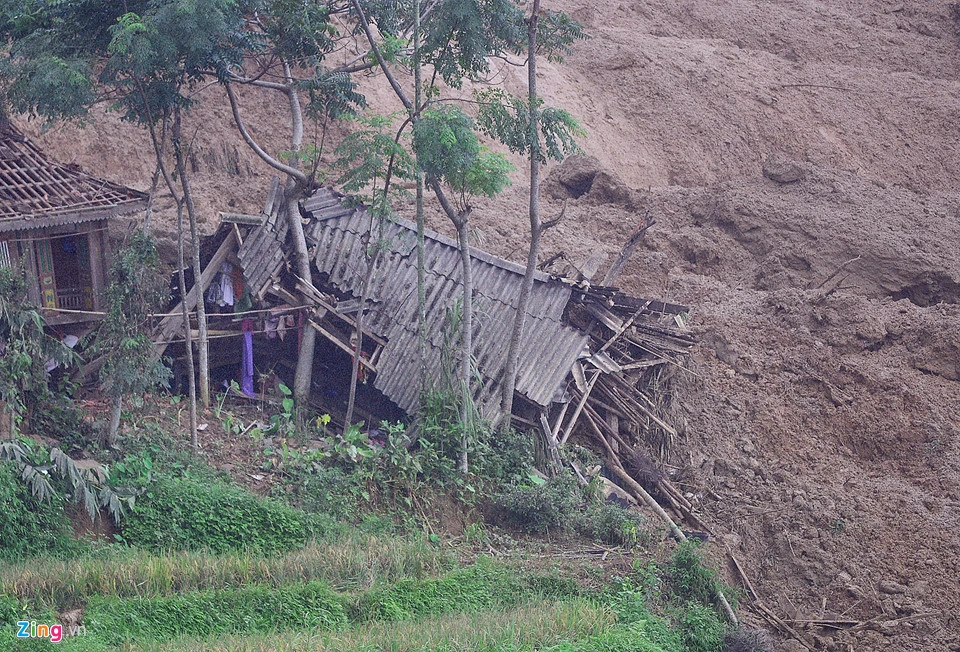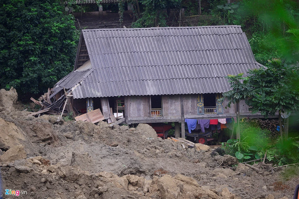 Một nhà sàn may mắn dưới chân đồi không bị hư hại. Số người trong nhà này cũng thoát chết.