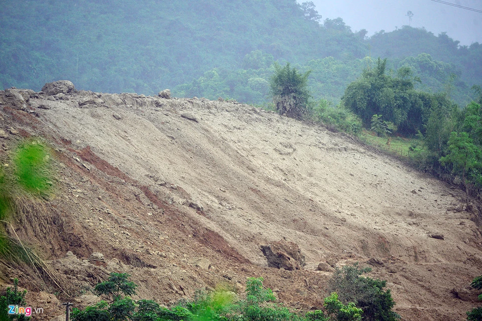 Hàng nghìn mét khối đất đổ xuống từ trên đồi, phủ kín các ngọn đồi thấp xung quanh.