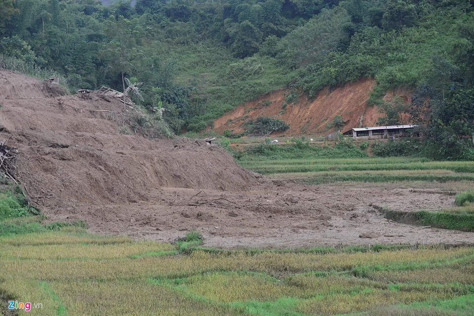 Đất đá tràn xuống đồng ruộng với bán kính hàng chục mét.