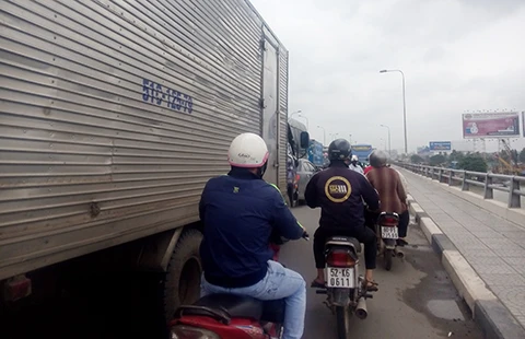 Khoảng 9 giờ sáng 8-8, có mặt tại trạm thu phí cầu Đồng Nai, chúng tôi thấy lượng phương tiện lưu thông từ hướng TP.HCM về Đồng Nai rất đông. Các loại xe chen chúc kéo dài hàng trăm mét từ trạm thu phí qua cầu Đồng Nai cũ đến tận cầu Tân Vạn. Hàng trăm ô tô xếp thành 4-5 hàng, chiếm hết cả làn đường dành cho xe hai bánh. Để thoát khỏi đám đông, người đi xe máy phải bất chấp nguy hiểm để leo lên lề hoặc len lỏi vào kẽ hở giữa các ô tô.