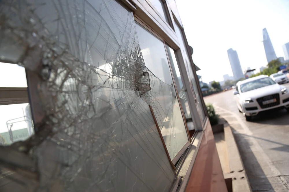 Cửa kính tại một cabin của trạm thu phí bị bể, hư hỏng.