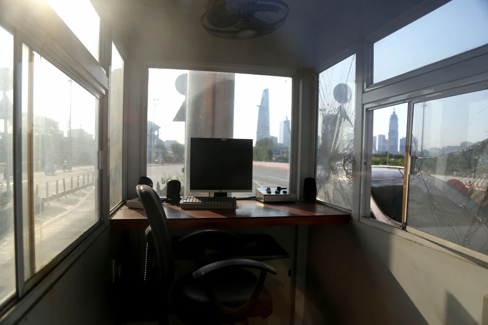 Bên trong cabin thu phí có đầy đủ các thiết bị tiện nghi như máy tính, máy lạnh, quạt gió...