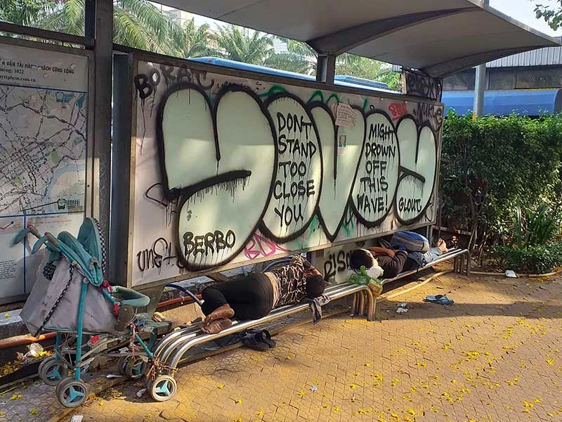 Không chỉ một mà nhiều lần đi ngang qua đây tôi đều thấy cảnh người ta nằm ngủ tại trạm xe buýt này. Bên cạnh đó, bảng quảng cáo tại trạm bị bôi vẽ nhếch nhác. Nhìn tổng thể cảnh quan nơi đây rất phản cảm, khi mà con đường này có nhiều du khách nước ngoài qua lại.