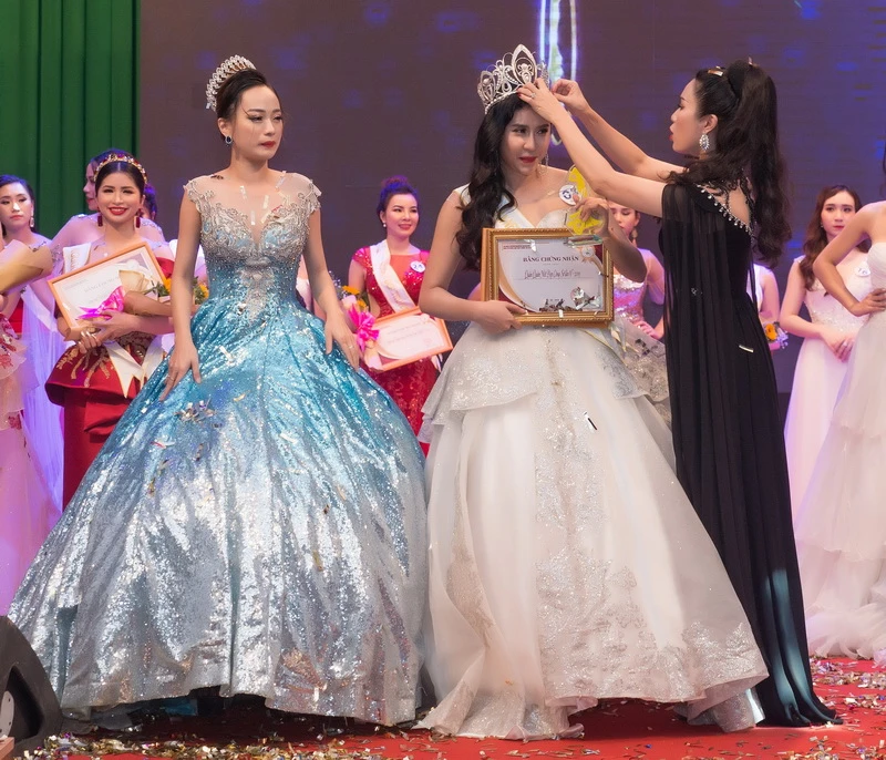 Kiều Vy nhận vương miện từ giám khảo Trịnh Kim Chi và người đẹp tiền nhiệm.