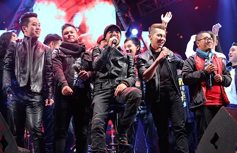 Các nghệ sĩ và Trần Lập (giữa) trong đêm nhạc "Đôi bàn tay thắp lửa" 01-2016 . Ảnh: VIẾT THỊNH