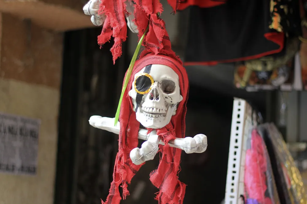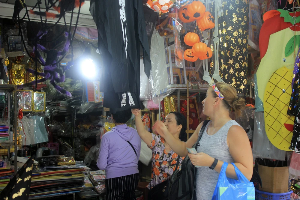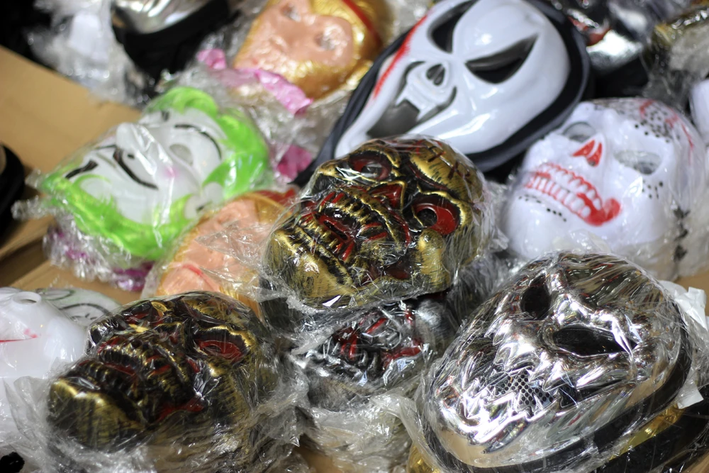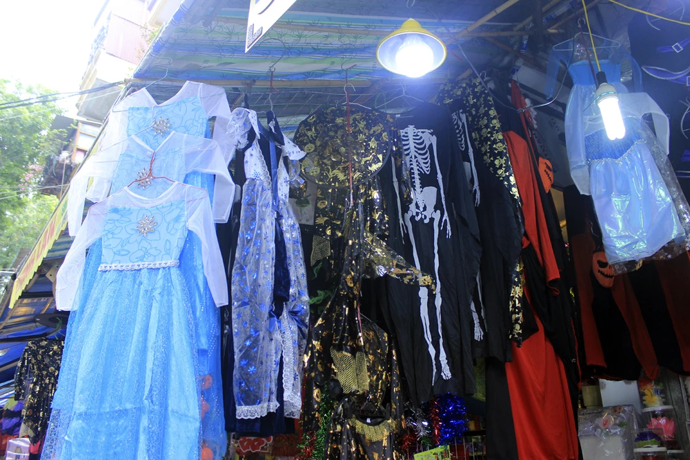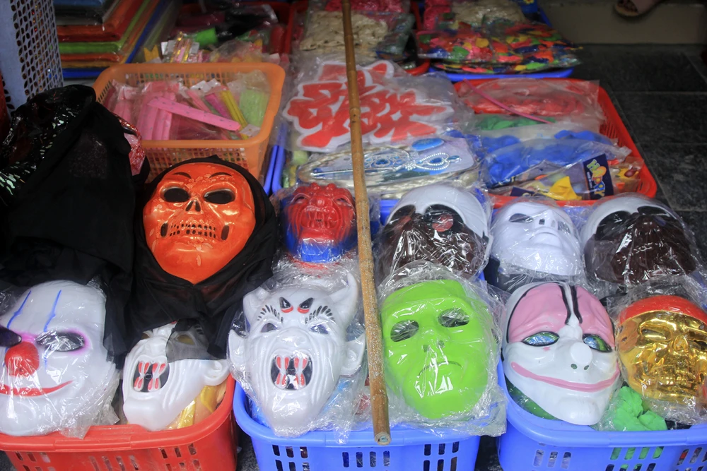 Tại đây, nhiều mặt hàng khá phong phú như mặt nạ, sọ đầu lâu, bí ngô… được bày dọc cả con phố. Chúng có giá 40.000-120.000 đồng, tùy từng đồ vật.